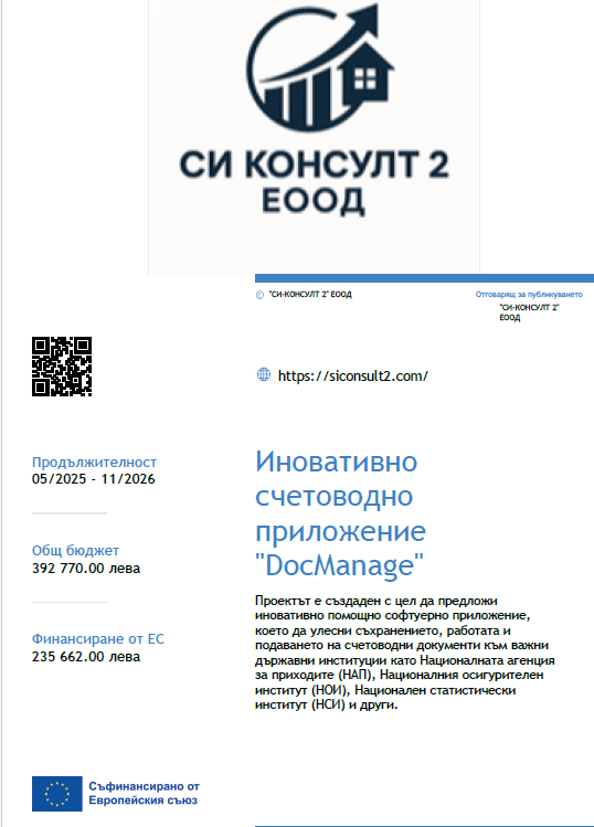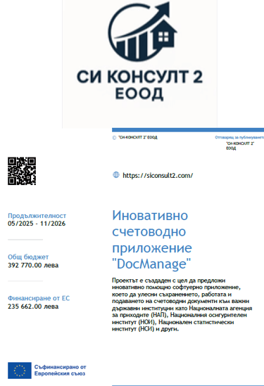 Проектът DocManage е създаден с цел да предостави иновативно софтуерно приложение, което значително улеснява управлението на счетоводни документи. С него можете бързо и сигурно да съхранявате, обработвате и подавате документи към важни държавни институции като НАП, НОИ, НСИ и други.